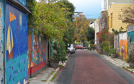 If you're driving- use the map. Balmy is a small alley with many pedestrians, please park nearby and walk through- it's a much better way to appreciate the murals. (24th Street and small parts of the side streets are the only ones that are metered).